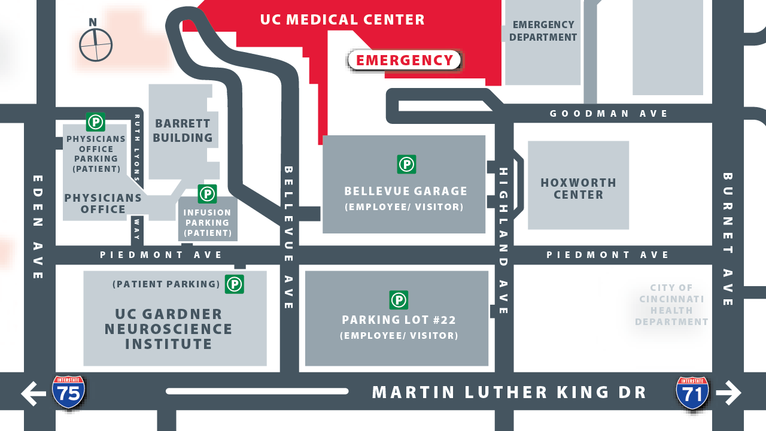 UC Health Clifton Campus is served by Cincinnati Metro routes 24, 37, 38, and 51. Stops are located along Martin Luther King Drive at Highland Avenue and Eden Avenue. For more information, visit go-metro.com or download the Transit app.
