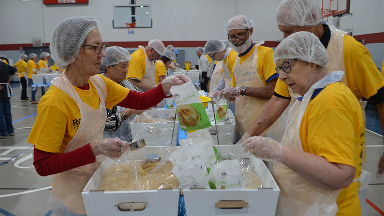 The meal packaging project is a prime example of connections that are meeting a critical need in the community. Rotary member Rick Flynn’s Flynn & Company CPAs sponsored purchase of the 12,000 meal packets. The majority of the packaging volunteers are Rotary Club members. UC Health will distribute the 12,000 meals to patients in the health system’s primary care clinics through the Food Is Medicine program, a partnership with the Sam Hubbard Foundation and the Freestore Foodbank, that supports individuals and families affected by food insecurity by providing free food, hygiene items and Freestore produce vouchers during visits to their primary care providers.