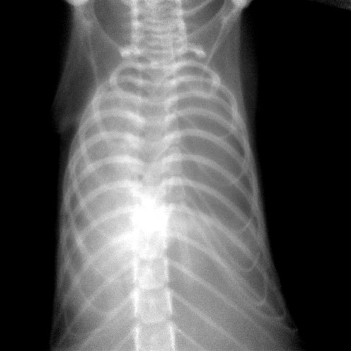 The PAM mouse model study was inspired by a patient seen by Dr. McCormack in 2011 at UC Medical Center. The woman had been diagnosed with PAM as a child in Jordan and developed exertional dyspnea at the age of 54, a typical pattern for PAM. Chest examination revealed bibasilar crackles, pulmonary function tests revealed mild restriction and reduced diffusing capacity, and a six-minute-walk test revealed normal exercise capacity with mild exertional desaturation to 88%.1 Chest X-ray showed fine hyper dense lower lung zone nodular opacities, and computed tomography of the chest showed symmetrical lower lobe predominant micronodular calcifications along bronchovascular bundles and interlobular septal thickening, findings pathognomonic for PAM.1